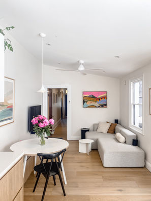 Patched in existing floor with recycled blue gum. Sanded the whole apartment and refinished.