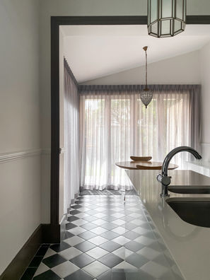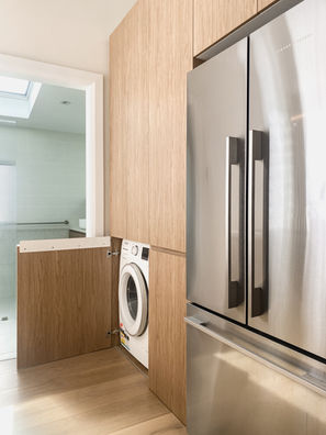 Redesigned the kitchen layout with a skylight above the island and relocated the laundry into the kitchen area.